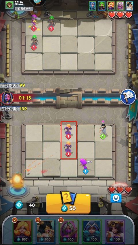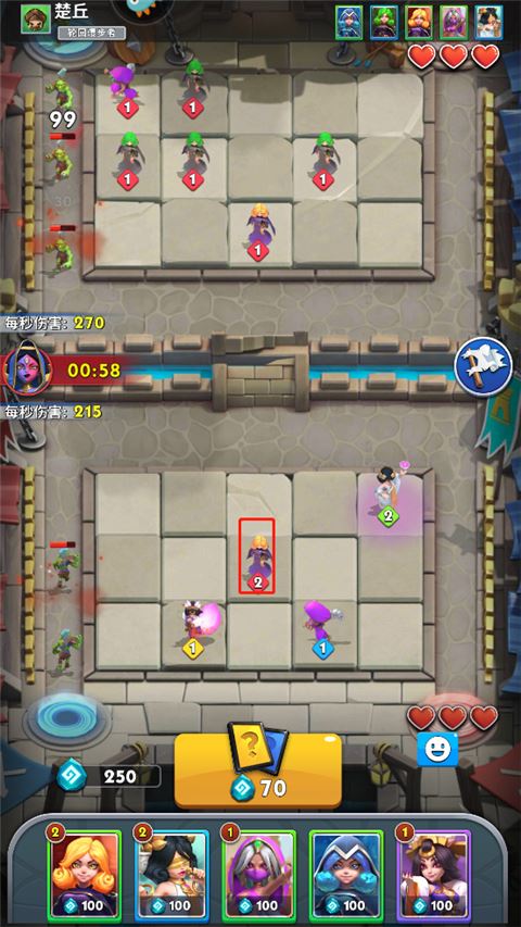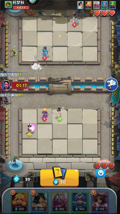 2、游戏中,双方各占一片场地,各自拥有三点生命值。当敌人突破防线时,生命值会减少,生命值归零时游戏结束。玩家需要花费宝石来布置英雄,使其攻击敌人;