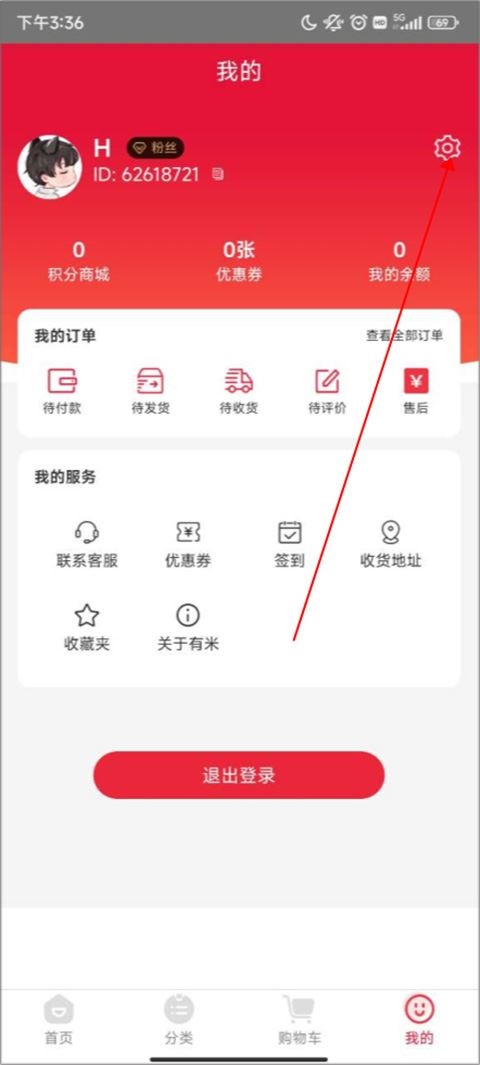 1、打开有米日记应用,进入“我的”页面,点击右上角的齿轮图标。