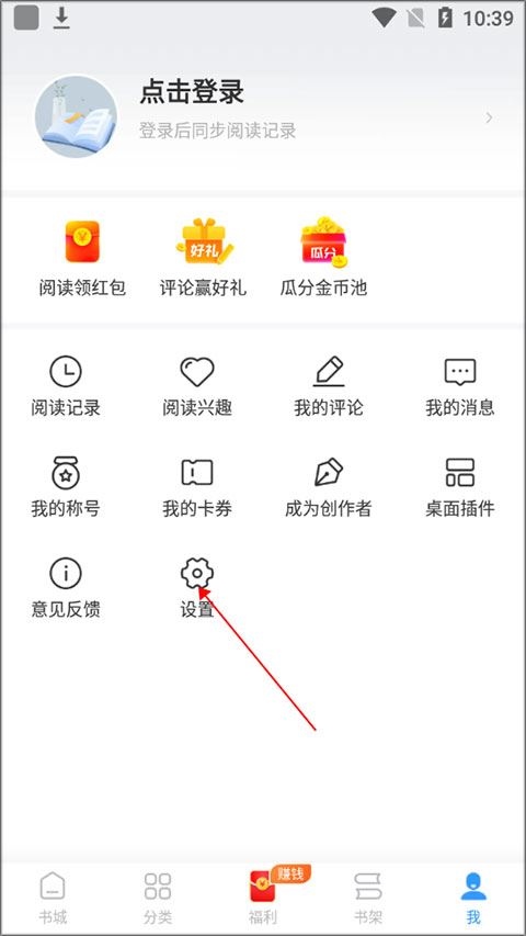 1、打开疯读小说,进入【我】界面,点击【设置】按钮。