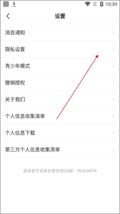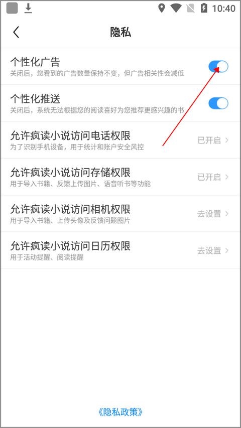 3、进入【隐私】页面,点击关闭【个性化广告】开关。