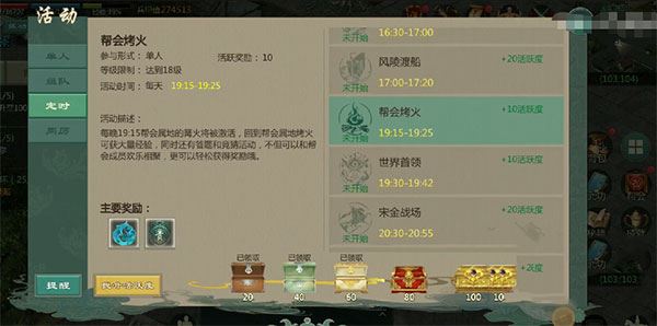 烤火玩法每天只有一次,时间是19:15至19:25。届时玩家需要返回帮会基地,前往指定的烤火地点。