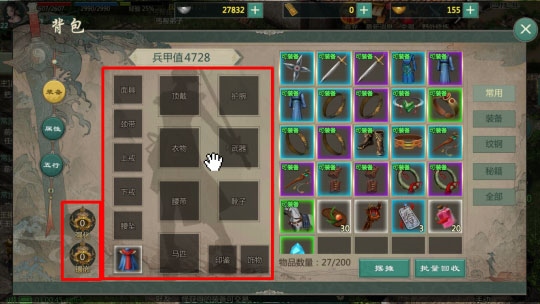 人物装备主要包括:顶戴、衣服、腰带、护腕、武器、靴子、面具、颈戴、上戒、下戒、腰坠、马匹、印鉴、饰物、披风。