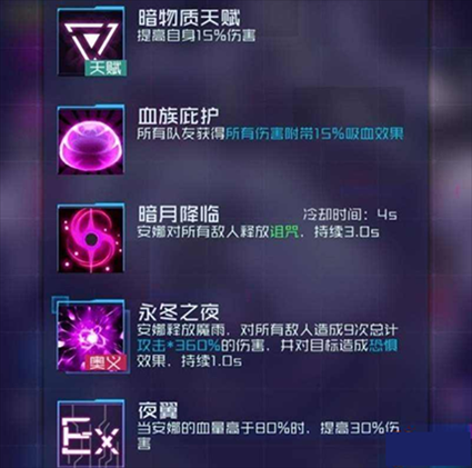 ex技能夜翼:当安娜的血量超过80%时,造成30%的额外伤害。