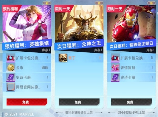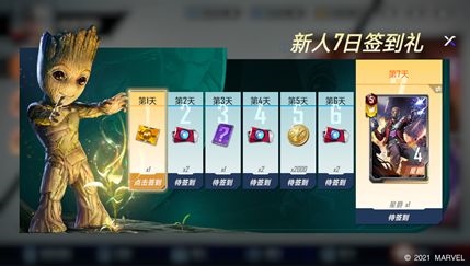 连续7天登录游戏并签到,即可领取丰厚奖励。累计签到7天后,还可以在蜘蛛侠、星爵、钢铁侠、索尔之间选择一张传奇橙卡!