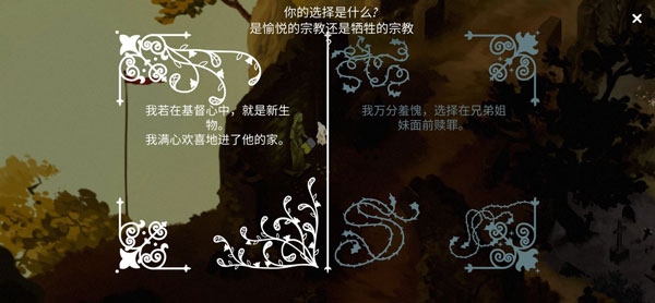 注:我第一次玩时也完成了这些任务,但第一个选择没有出现。我的猜测是,只有在早期章节中倾向于选择善良的路径,才会触发“愉悦的宗教”选项,但这仅仅是我的推测。