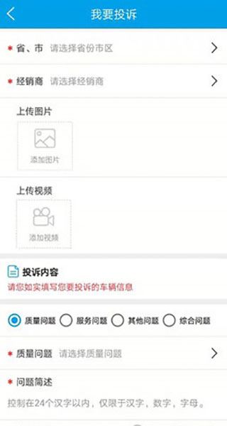 2、输入车辆品牌及问题描述,并可以选择上传图片或视频进行投诉。