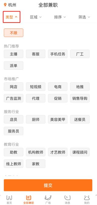 2、点击“类型”可以根据需求选择合适的职位类型;