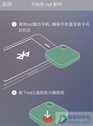 3、将nut与手机进行配对。绑定nut后,您可以通过点击“+”进入绑定页面,长按nut贴片按钮,听到声音和看到闪光后,配对即完成。