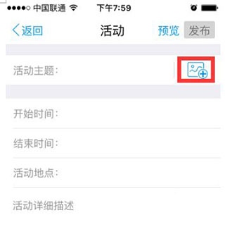 3、选择好主题类型后,进入活动内容创建页面,在这里可以添加活动名称、图片,设置活动时间、地点,并详细描述活动内容。