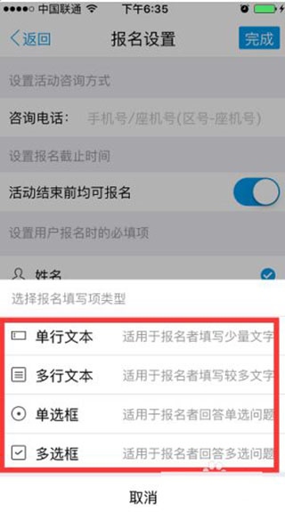 6、在报名设置中,“添加自定义填写项”可根据活动需求,设置报名者填写信息的内容与方式,如单行文本、多行文本、单选、多选等。