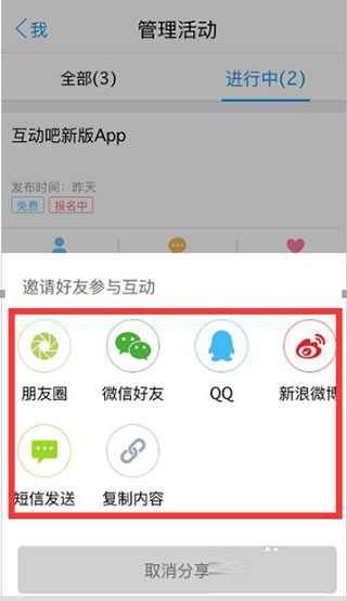 10、活动发布后,你可以点击“分享”按钮,一键将活动推广到朋友圈、微信好友、qq、新浪微博等社交平台,也可以通过短信或“复制内容”功能分享活动。