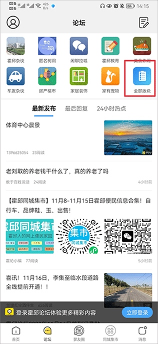 1、打开霍邱论坛,进入论坛界面后点击“全部版块”