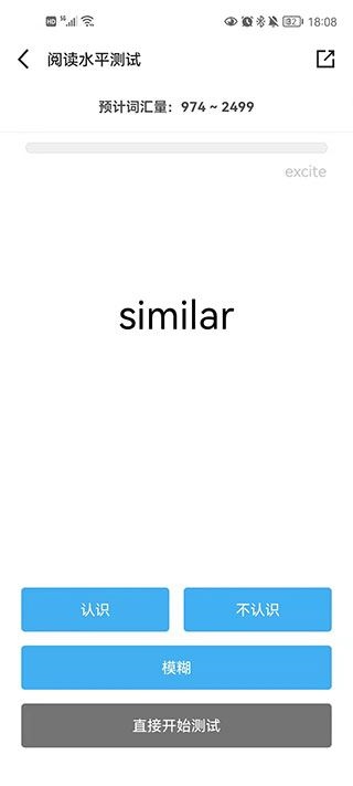 4、百词斩爱阅读提供了阅读水平测试功能,用户可以通过测试预测自己的词汇量,并根据结果调整难度,帮助你更好地学习,如下图所示: