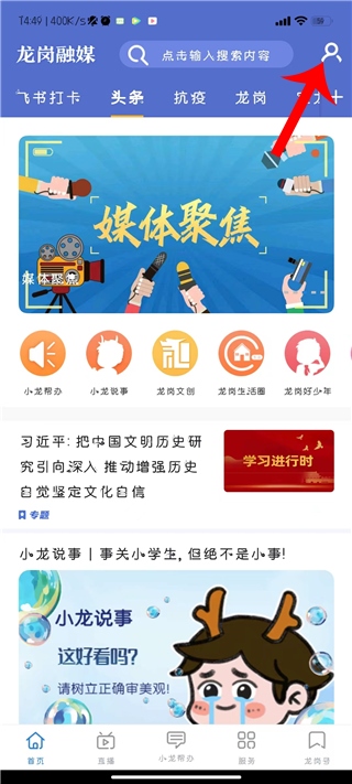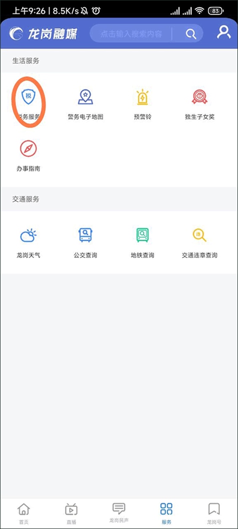 1、首先打开龙岗融媒,进入下载凯发游戏主页后点击底部的【服务】按钮进入服务界面。