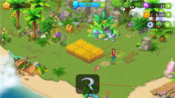 点击镰刀,将其拖到农作物上方,即可收获。