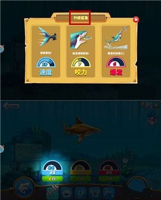 4、升级鲨鱼意味着增强它的能力。升级需要金币,而金币可以通过捕食获得。
