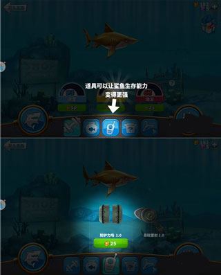 5、点击道具,进入道具界面,可以用金币购买,增强鲨鱼的生存能力。