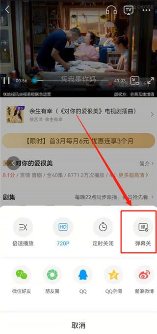 2、点击后会弹出操作菜单,选择“弹幕关”进行关闭。