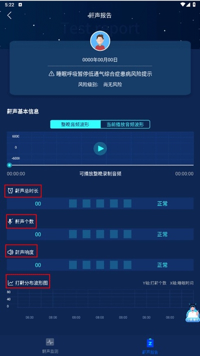 鼾声监测:能够精准记录鼾声的总时长、次数、强度和波形分布,全面展示鼾声数据。让打鼾者清楚地了解自己鼾声的具体情况,定期监控鼾声的变化,查看是否有所改善。