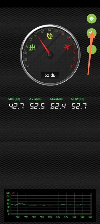 首先,打开噪音分贝仪,查看当前设备正在进行实时监测。接着,点击右上角的扳手图标。