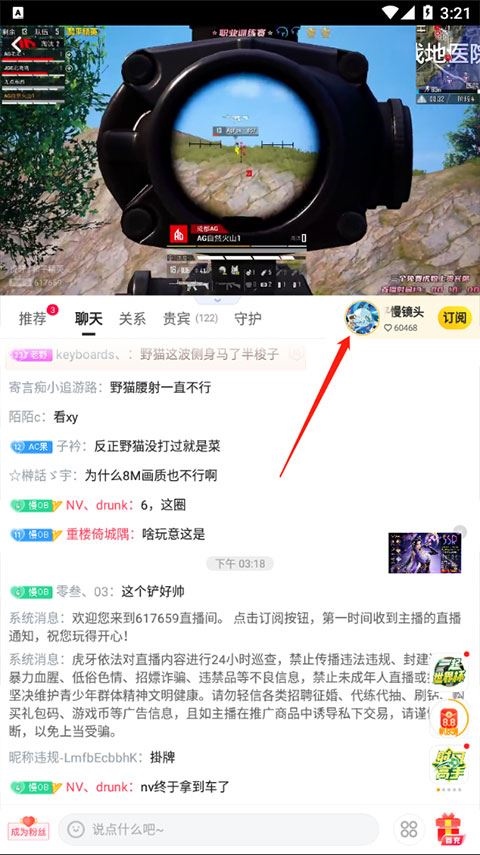 3、在直播间,点击主播的头像。